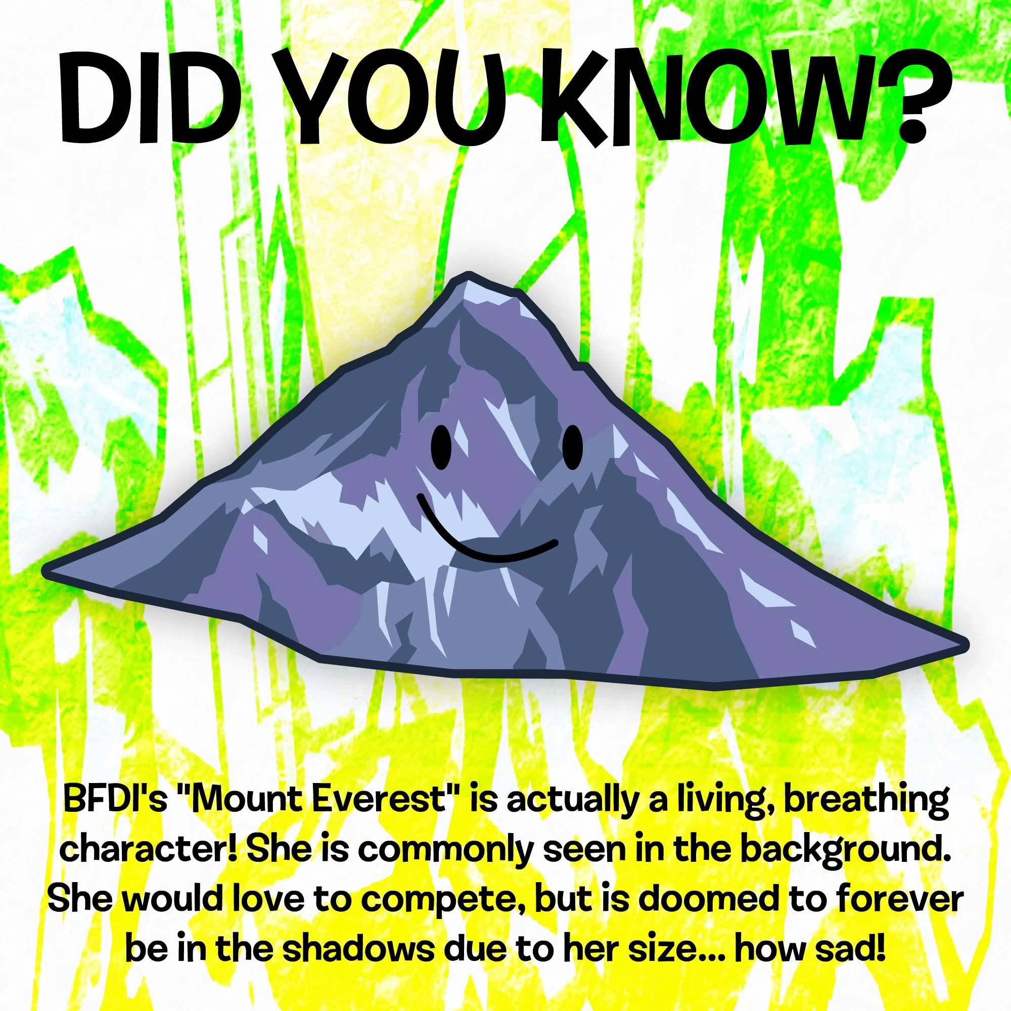 This was posted on November 27, 2025. The caption says: "BFDI's "Mount Everest" is actually a living, breathing character! She is commonly seen in the background. She would love to compete, but is doomed to forever be in the shadows due to her size... how sad!"