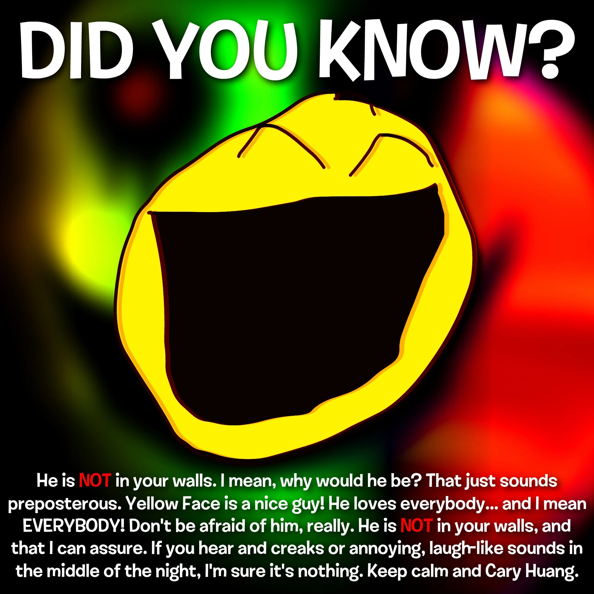 This was posted on September 3, 2024. The caption says: "He is NOT in your walls. I mean, why would he be? That just sounds preposterous. Yellow Face is a nice guy! He loves everybody... and I mean EVERYBODY! Don't be afraid of him, really. He is NOT in your walls, and that I can assure. If you hear and creaks or annoying, laugh-like sounds in the middle of the night, I'm sure it's nothing. Keep calm and Cary Huang."