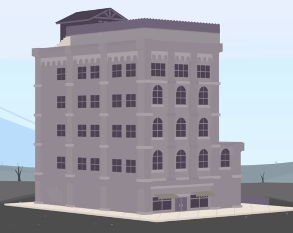 In "You Know Those Buttons Don't Do Anything, Right?", the interior of the hotel is shown in more detail and has a very hotel-like appearance, with a first floor that looks like a lobby and many rooms. There is also an elevator that leads to each floor, as well as to the roof. Each floor also has a different color, with the lobby being red, the second floor being orange, and so on.