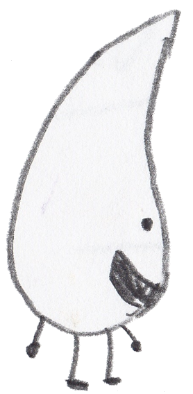 Teardrop appears to be a blue drop of lacrimal fluid, the fluid produced when eyes water, cleaning pathogens. Her outline is cyan, and her inside is azure, which gets lighter towards the center. When Teardrop is at her evaporation stage, she is a very light azure, which is hardly seen.