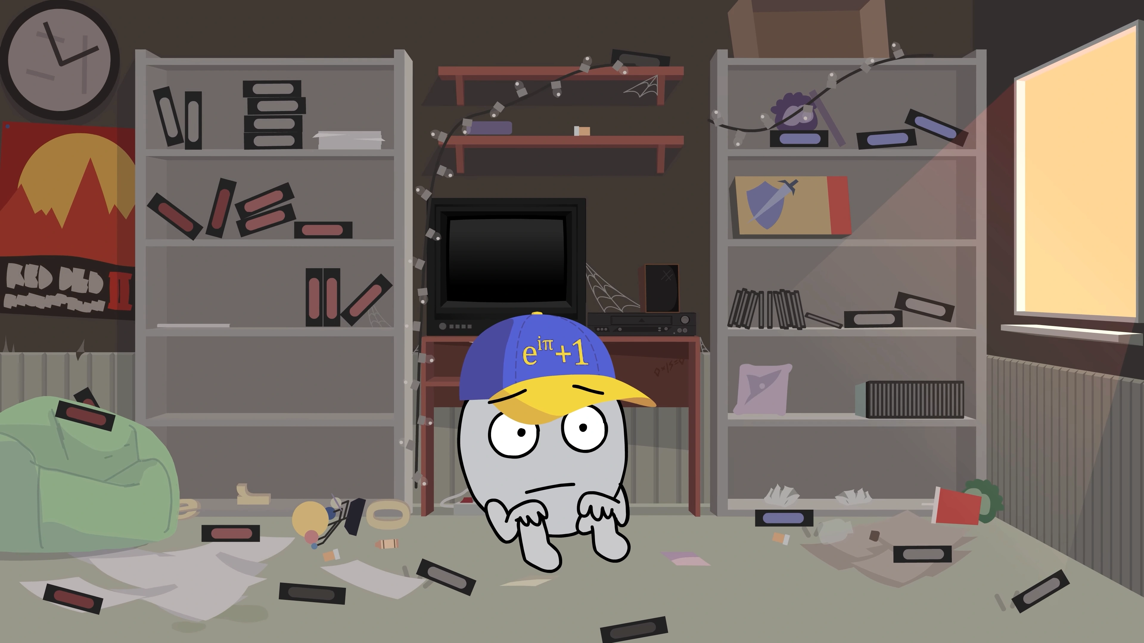 The AV room is where the Zeroes get their audiovisual entertainment. There is a Red Dead Redemption 2 poster on the wall, a statue of a Puffle from Club Penguin, and a dusty TV with a cassette player. Lots of cassettes and other items litter the ground.